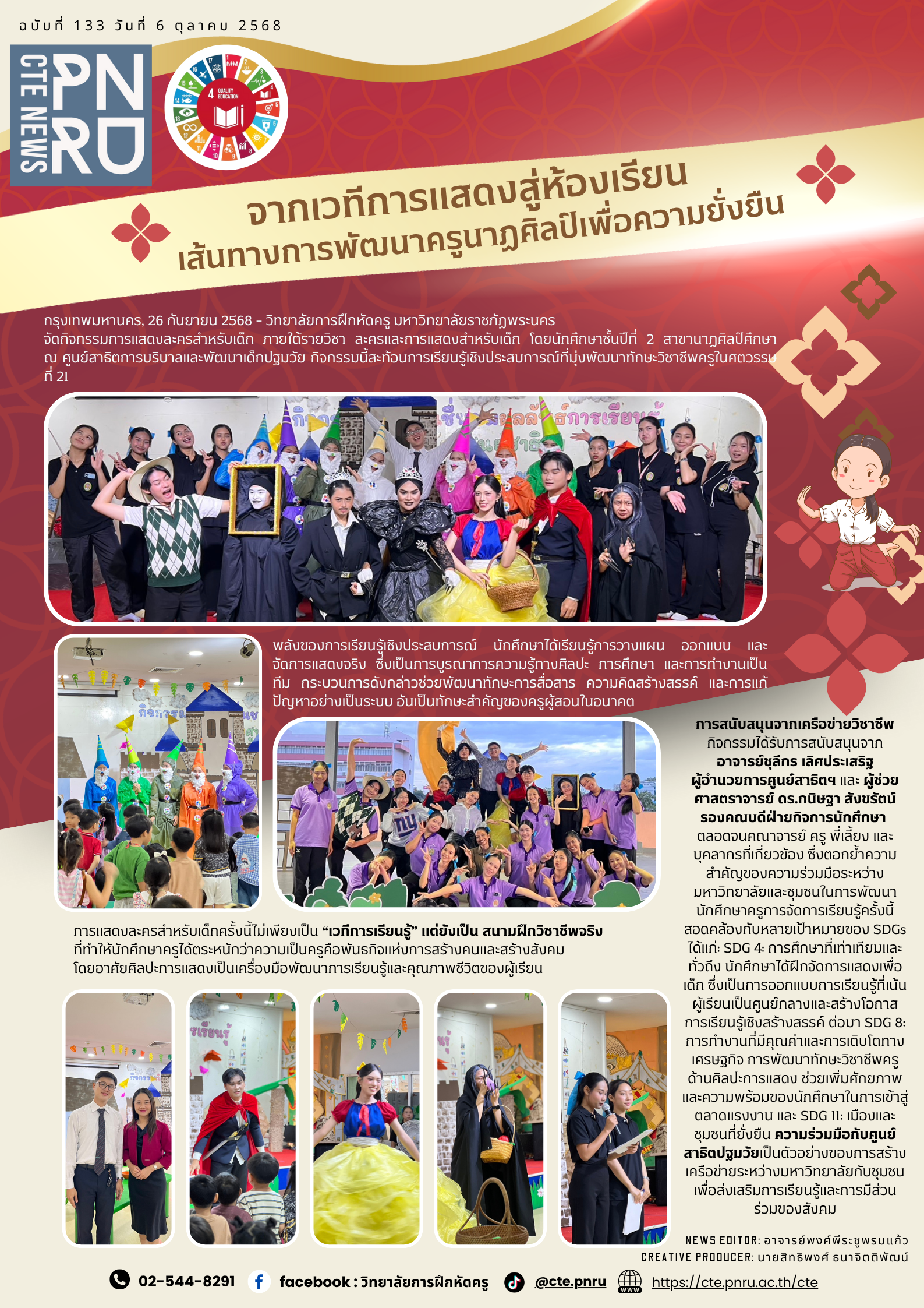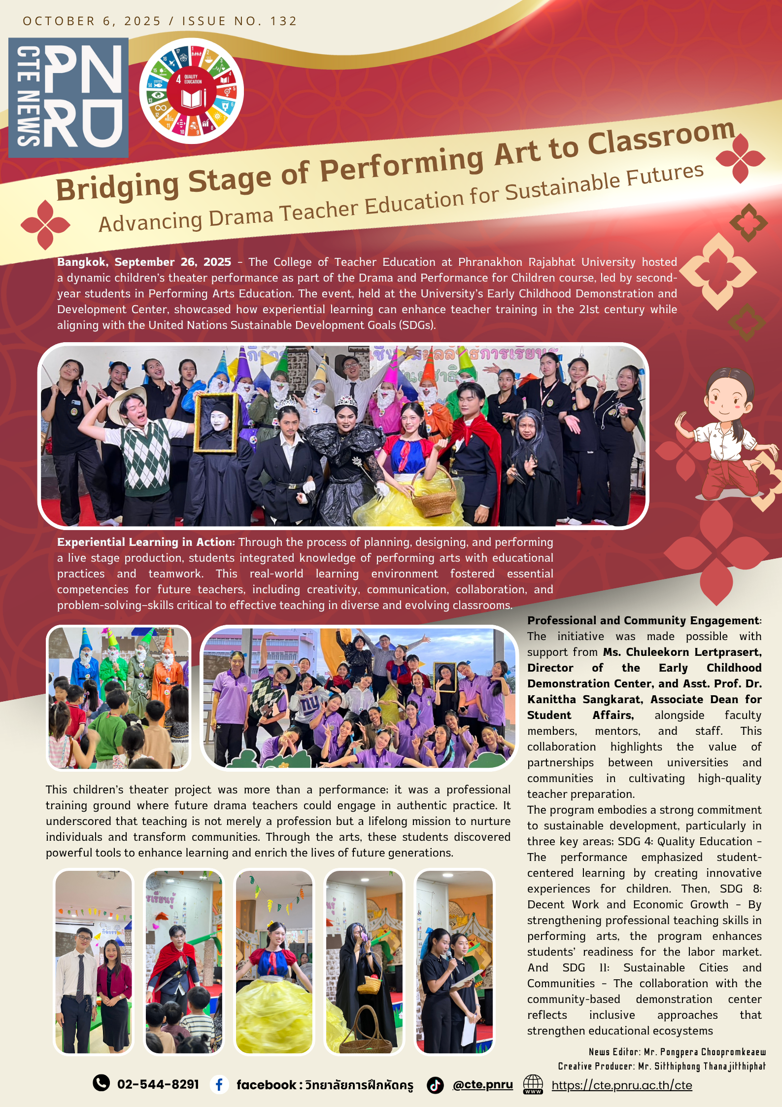 Bangkok, September 26, 2025 – The College of Teacher Education at Phranakhon Rajabhat University hosted a dynamic children’s theater performance as part of the Drama and Performance for Children course, led by second-year students in Performing Arts Education. The event, held at the University’s Early Childhood Demonstration and Development Center, showcased how experiential learning can enhance teacher training in the 21st century while aligning with the United Nations Sustainable Development Goals (SDGs).