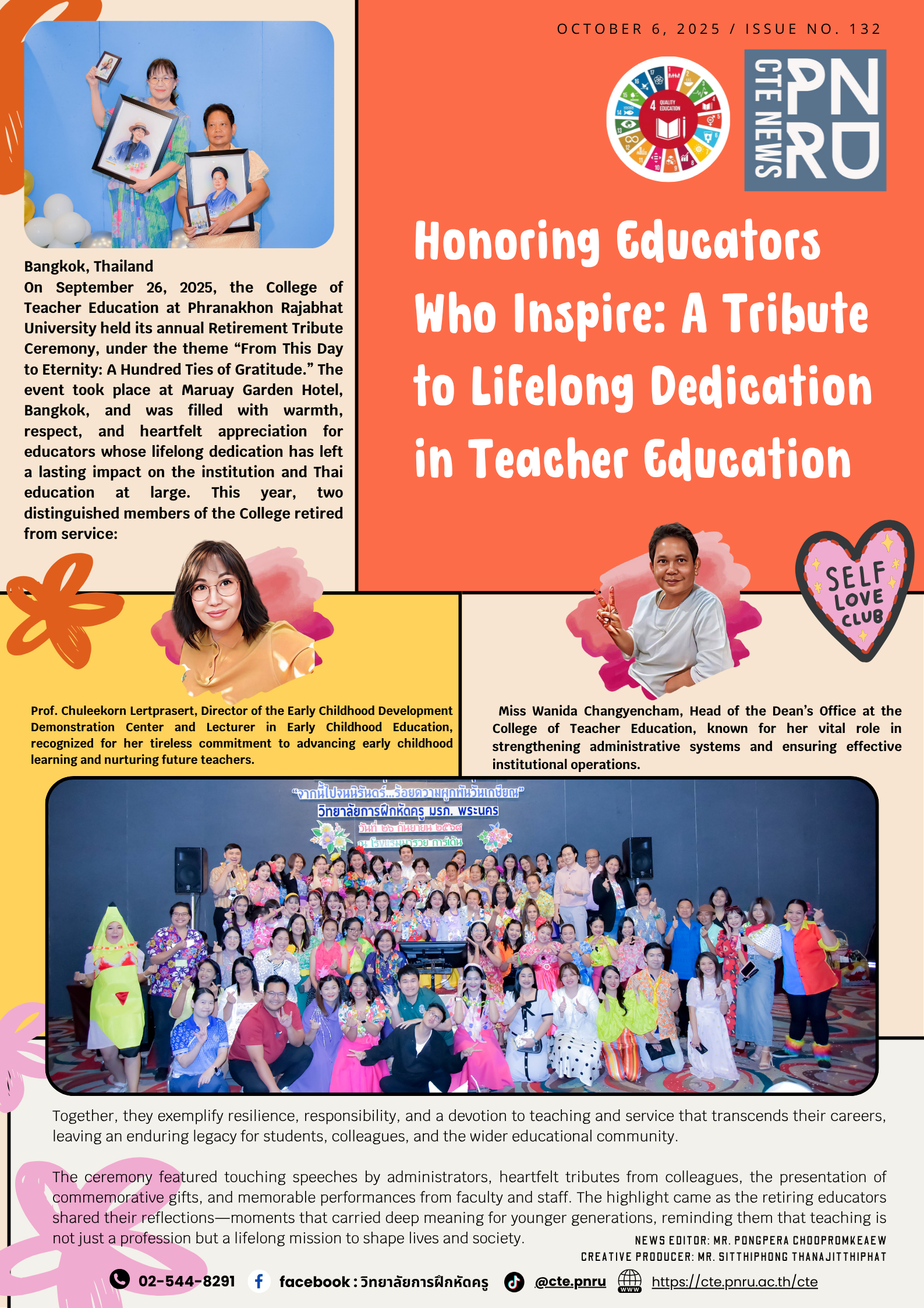 On September 26, 2025, the College of Teacher Education at Phranakhon Rajabhat University held its annual Retirement Tribute Ceremony, under the theme “From This Day to Eternity: A Hundred Ties of Gratitude.” The event took place at Maruay Garden Hotel, Bangkok, and was filled with warmth, respect, and heartfelt appreciation for educators whose lifelong dedication has left a lasting impact on the institution and Thai education at large. This year, two distinguished members of the College retired from service: