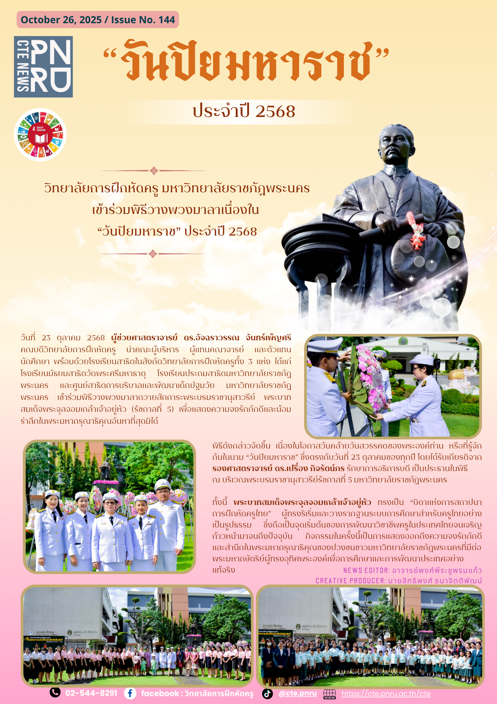 วันที่ 23 ตุลาคม 2568 ผู้ช่วยศาสตราจารย์ ดร.อัจฉราวรรณ จันทร์เพ็ญศรี คณบดีวิทยาลัยการฝึกหัดครู นำคณะผู้บริหาร ผู้แทนคณาจารย์ และตัวแทนนักศึกษา พร้อมด้วยโรงเรียนสาธิตในสังกัดวิทยาลัยการฝึกหัดครูทั้ง 3 แห่ง ได้แก่ โรงเรียนมัธยมสาธิตวัดพระศรีมหาธาตุ โรงเรียนประถมสาธิตมหาวิทยาลัยราชภัฏพระนคร และศูนย์สาธิตการบริบาลและพัฒนาเด็กปฐมวัย มหาวิทยาลัยราชภัฏพระนคร เข้าร่วมพิธีวางพวงมาลาถวายสักการะพระบรมราชานุสาวรีย์ พระบาทสมเด็จพระจุลจอมเกล้าเจ้าอยู่หัว (รัชกาลที่ 5) เพื่อแสดงความจงรักภักดีและน้อมรำลึกในพระมหากรุณาธิคุณอันหาที่สุดมิได้