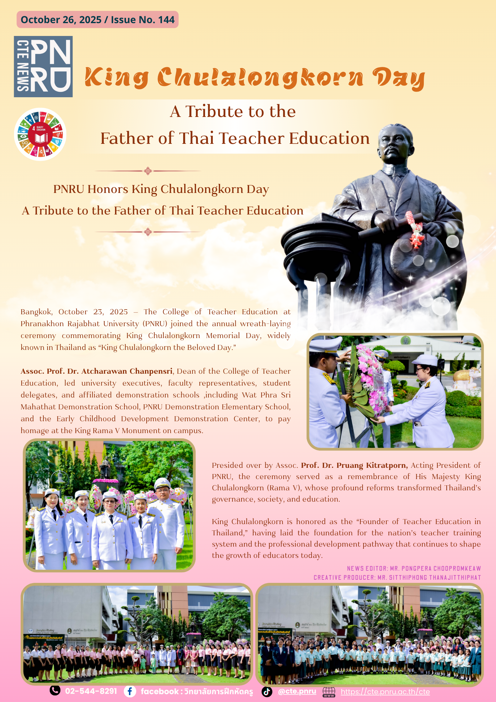Bangkok, October 23, 2025 — The College of Teacher Education at Phranakhon Rajabhat University (PNRU) joined the annual wreath-laying ceremony commemorating King Chulalongkorn Memorial Day, widely known in Thailand as “King Chulalongkorn the Beloved Day.”