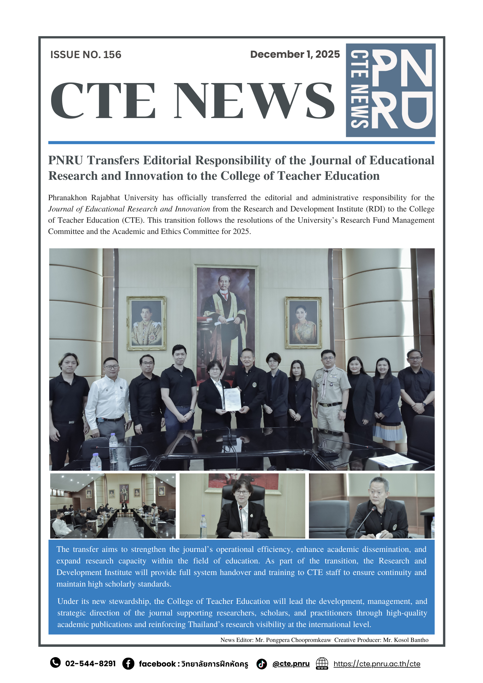Phranakhon Rajabhat University has officially transferred the editorial and administrative responsibility for the Journal of Educational Research and Innovation from the Research and Development Institute (RDI) to the College of Teacher Education (CTE). This transition follows the resolutions of the University’s Research Fund Management Committee and the Academic and Ethics Committee for 2025.