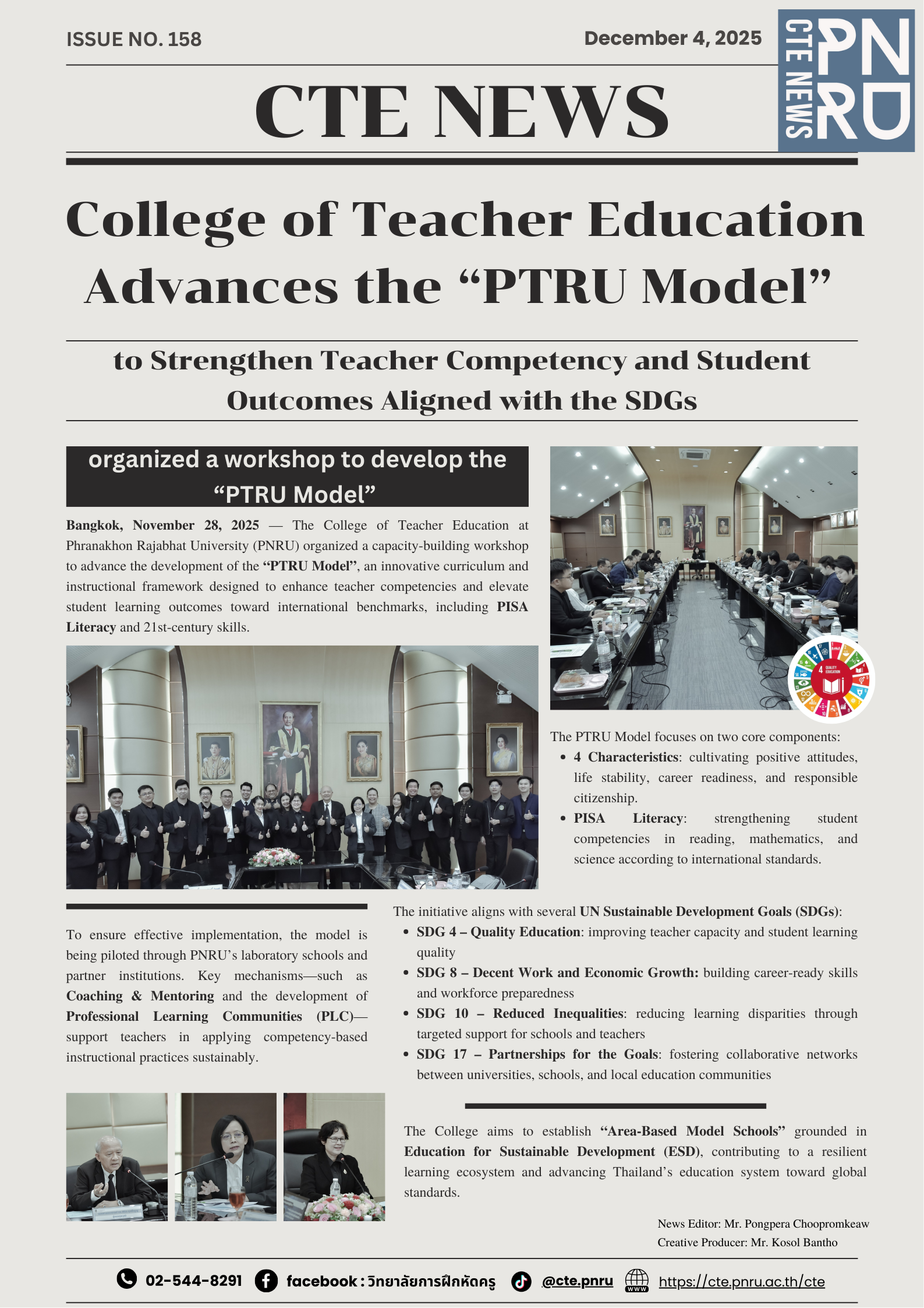 Bangkok, November 28, 2025 — The College of Teacher Education at Phranakhon Rajabhat University (PNRU) organized a capacity-building workshop to advance the development of the “PTRU Model”, an innovative curriculum and instructional framework designed to enhance teacher competencies and elevate student learning outcomes toward international benchmarks, including PISA Literacy and 21st-century skills.