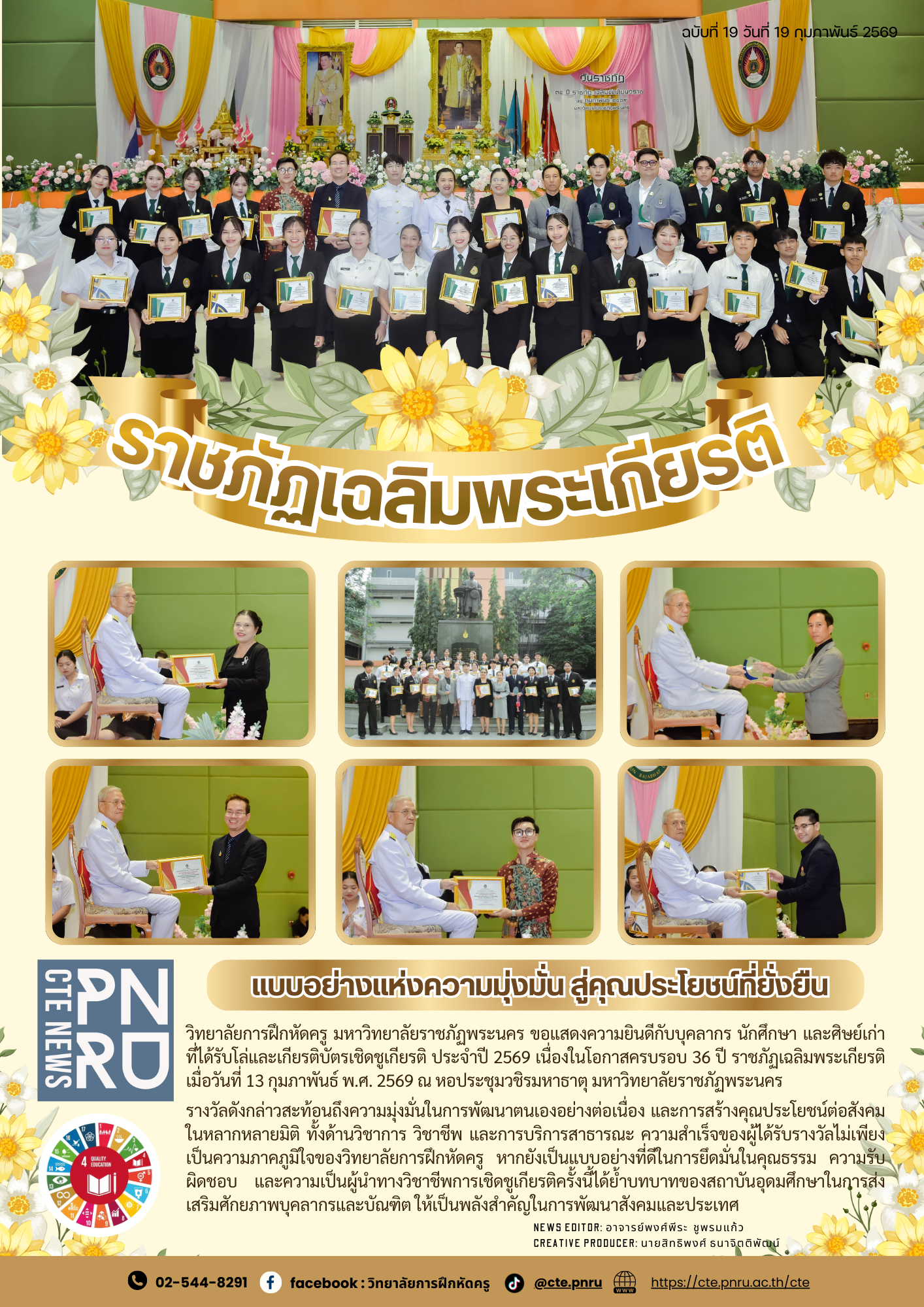 The College of Teacher Education at Phranakhon Rajabhat University extends its sincere congratulations to faculty members, students, and alumni who received commemorative plaques and certificates of recognition in 2026, marking the 36th Anniversary of Rajabhat Commemoration Day. The ceremony was held on February 13, 2026, at Vajiramahathat Auditorium on campus.