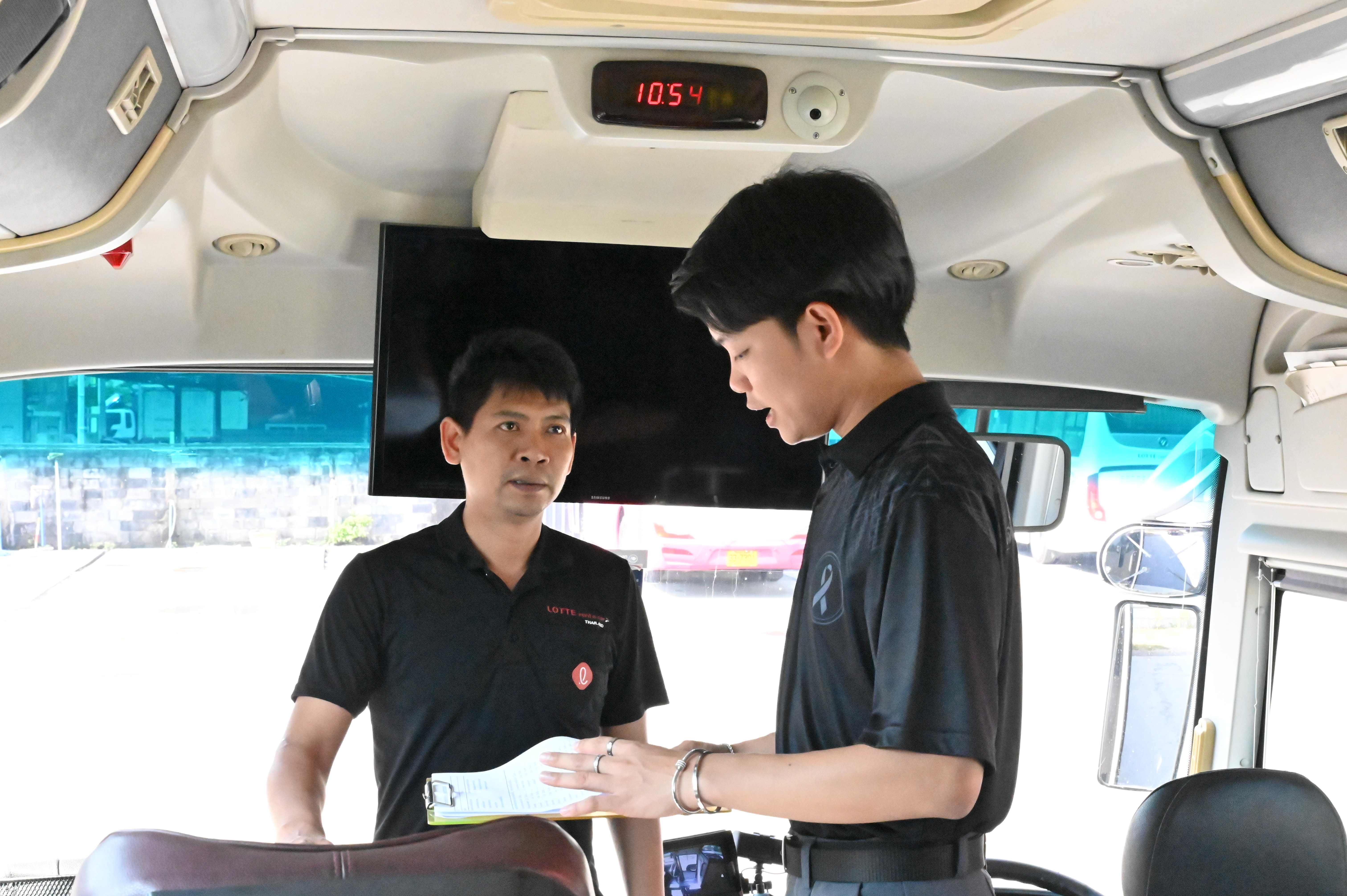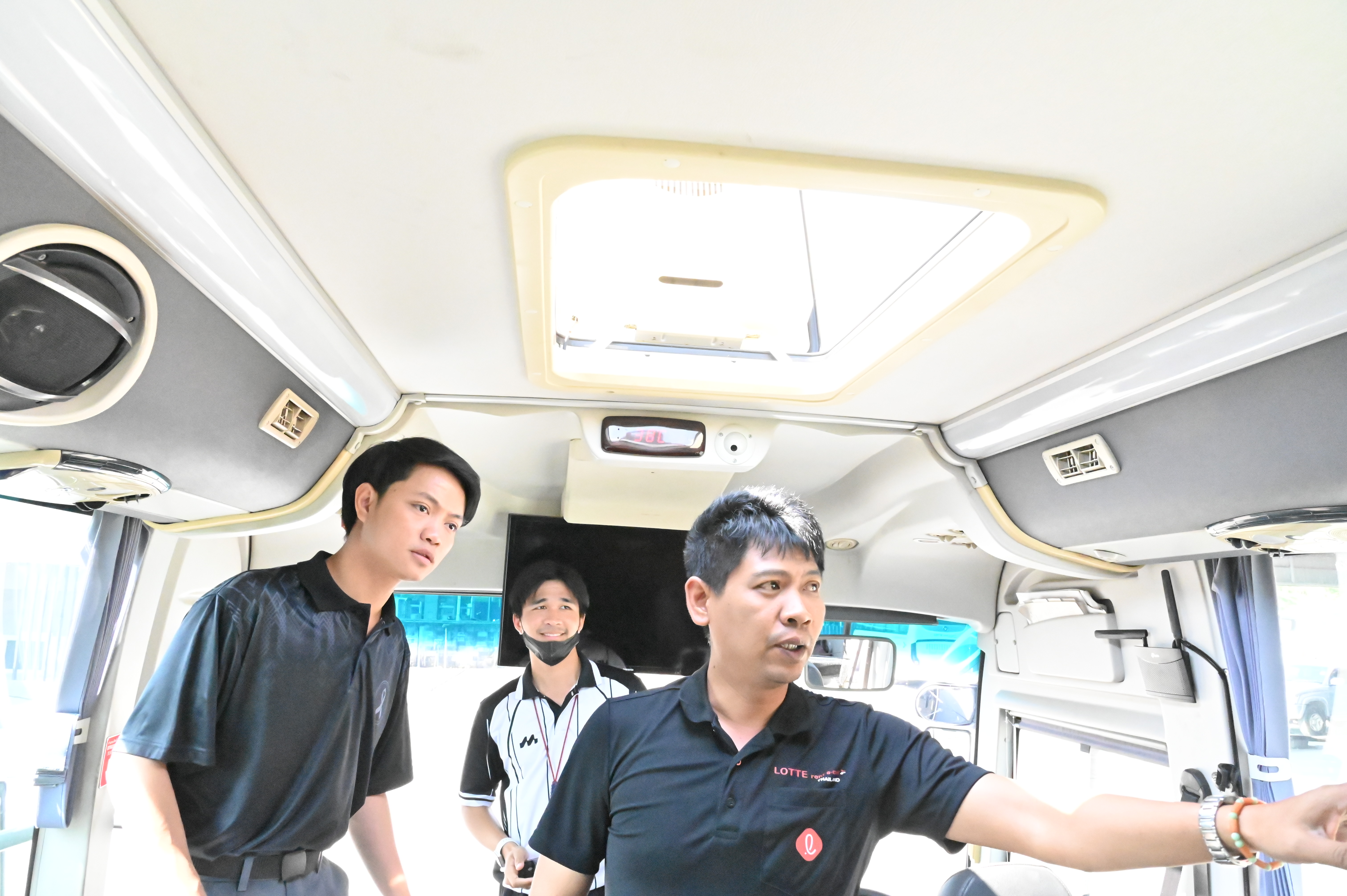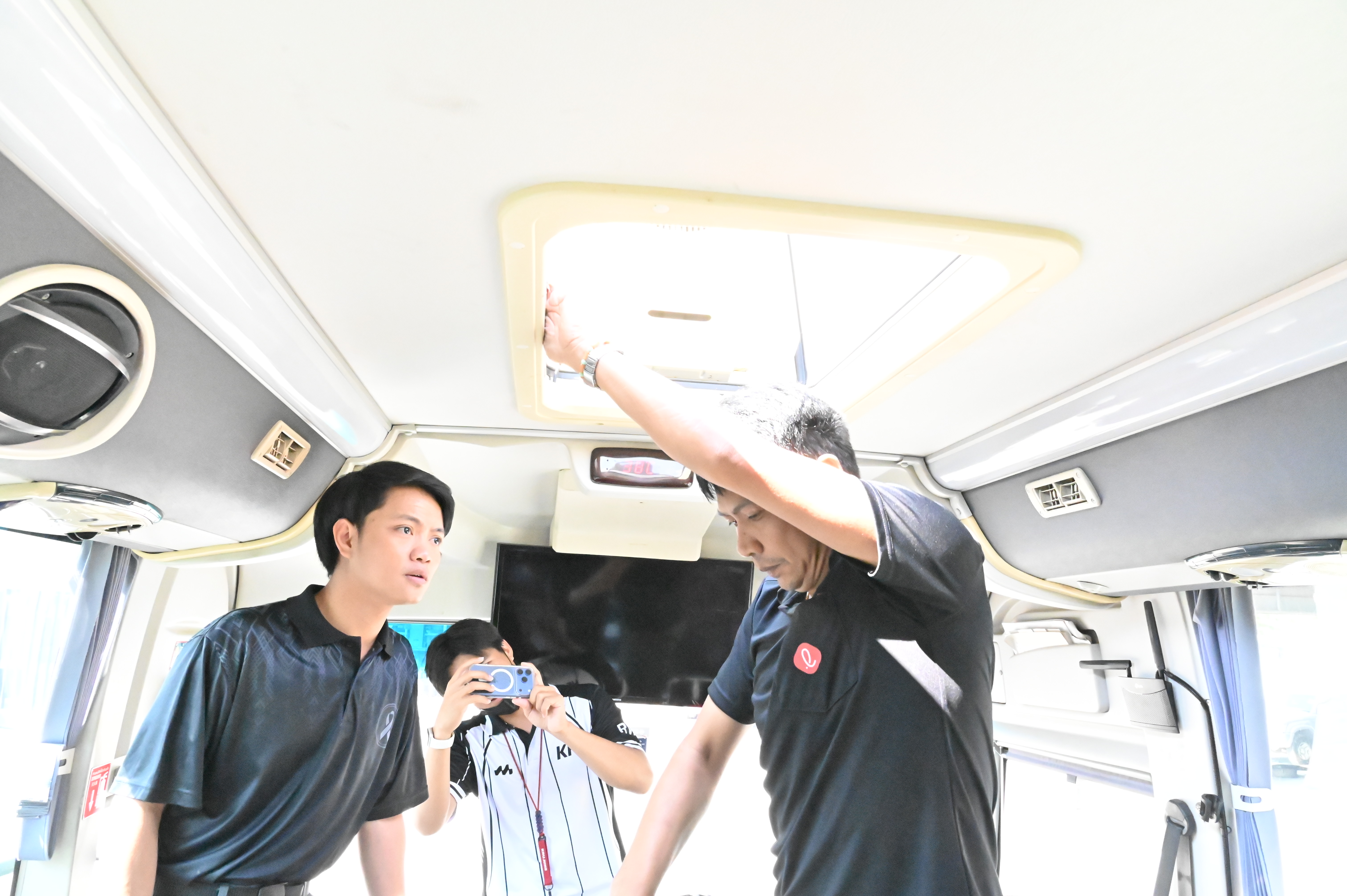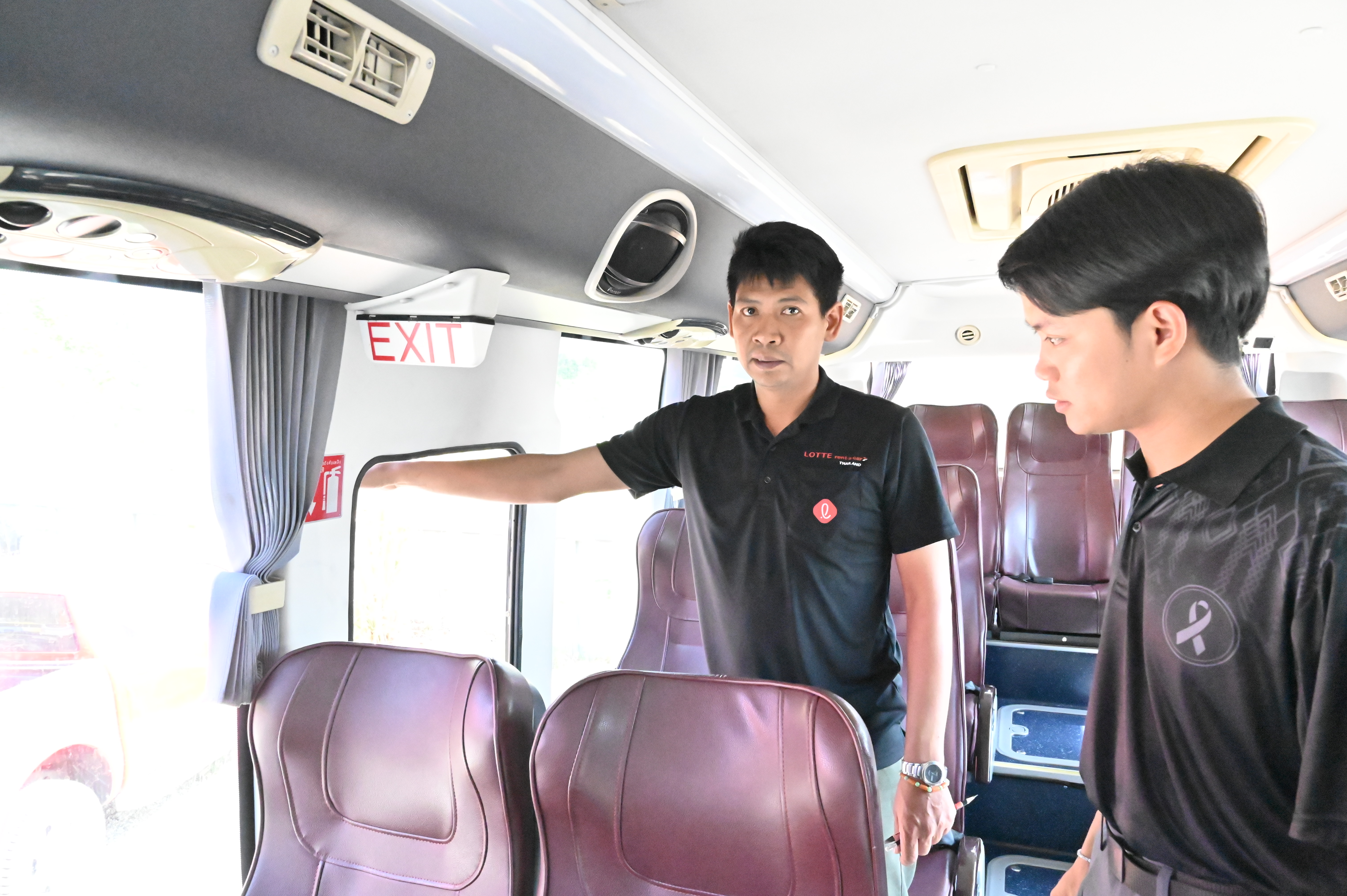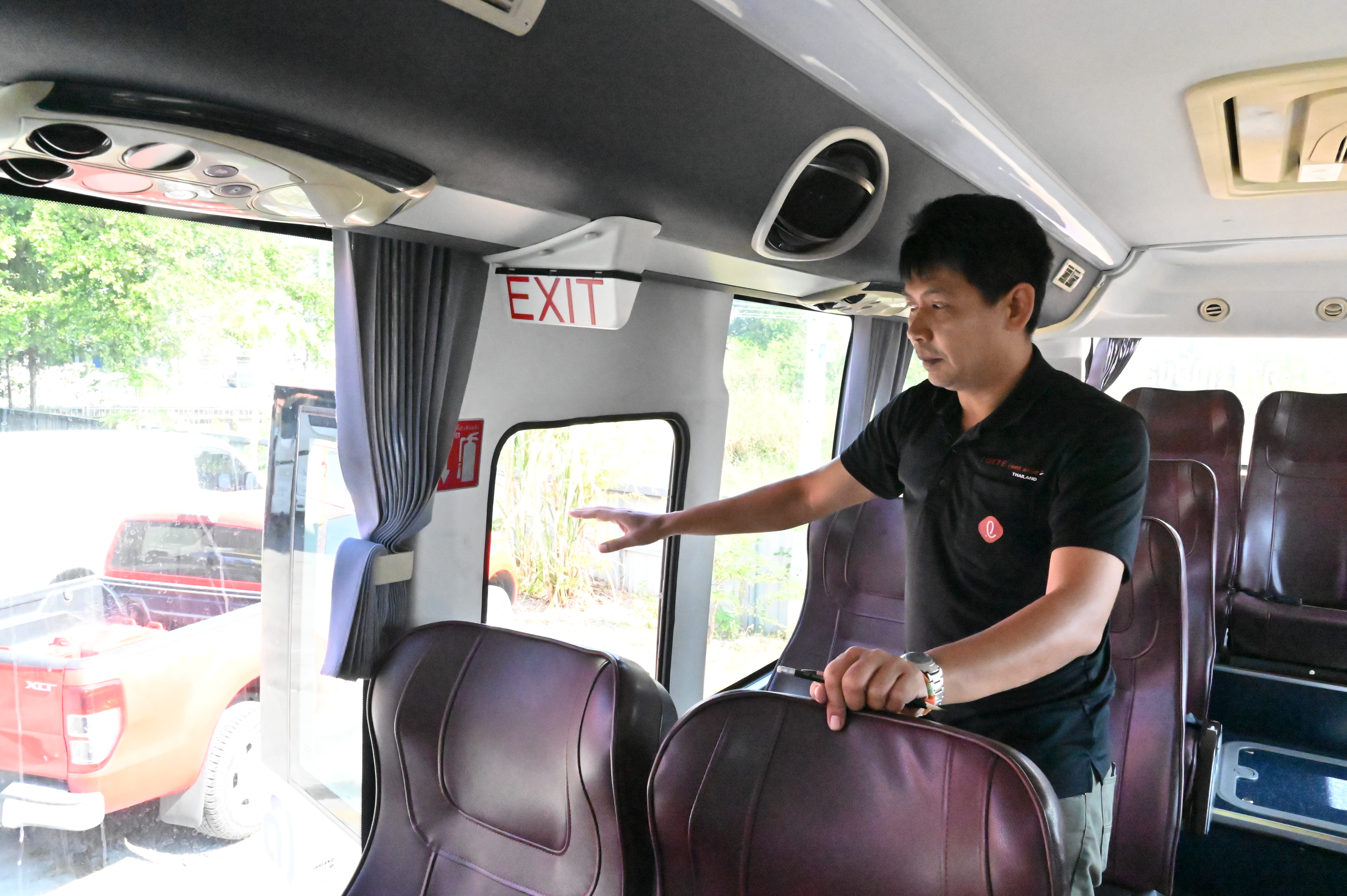 4. อุปกรณ์ความปลอดภัยภายในรถ ตรวจสอบเข็มขัดนิรภัย ที่นั่ง ทางออกฉุกเฉิน ค้อนทุบกระจก ถังดับเพลิง และชุดปฐมพยาบาลเบื้องต้น พบว่าอุปกรณ์อยู่ครบถ้วนและพร้อมใช้งาน