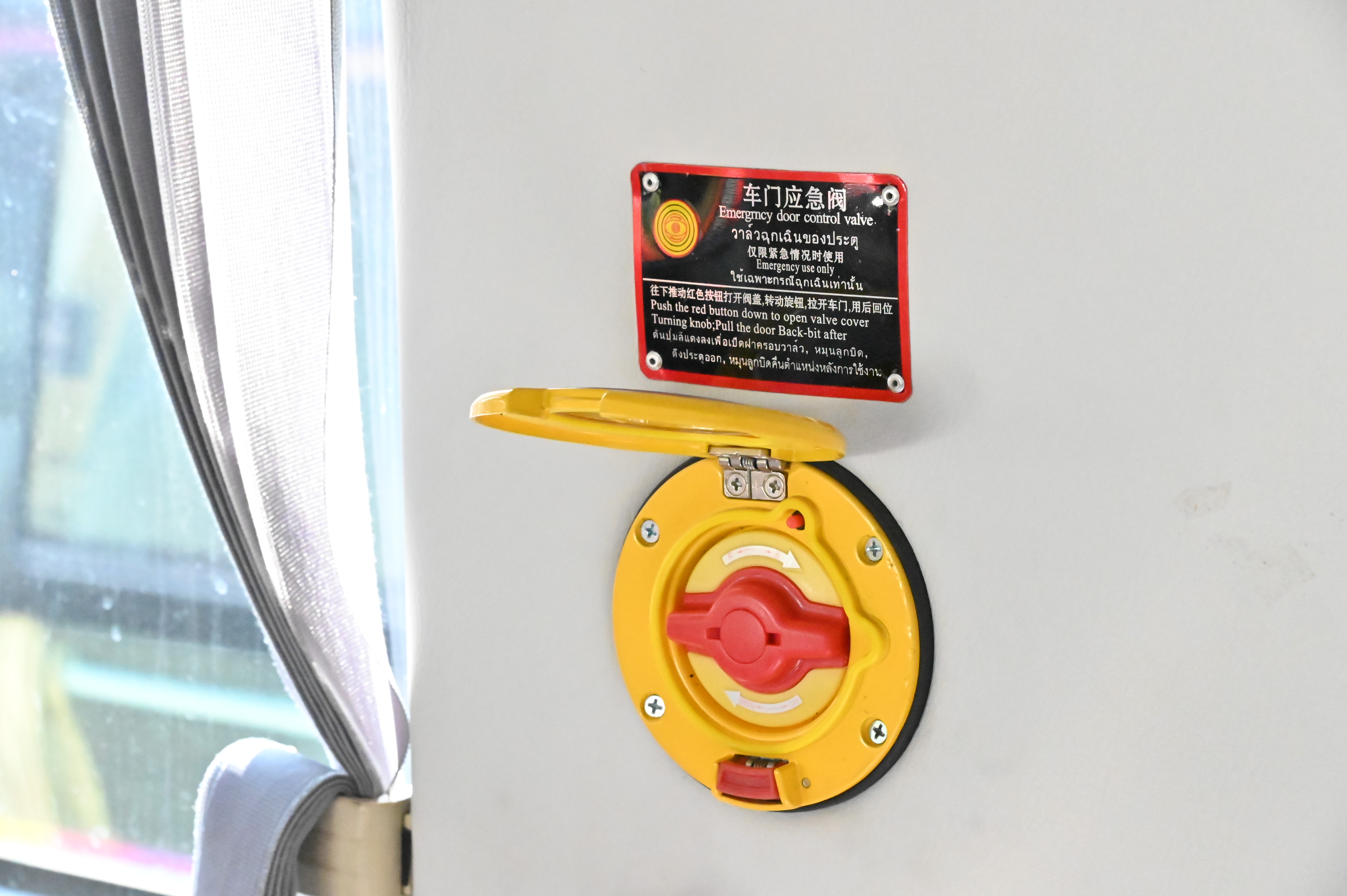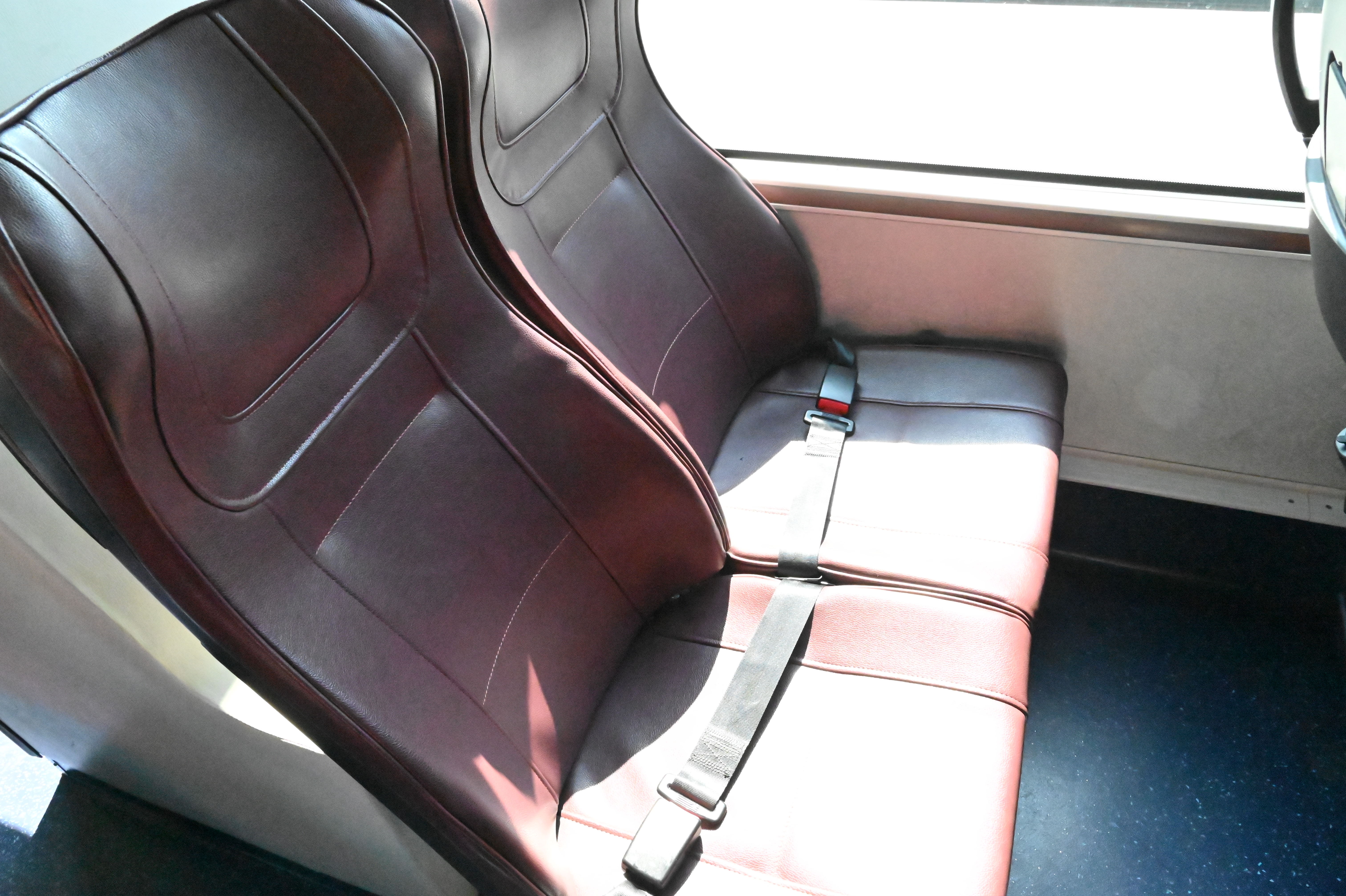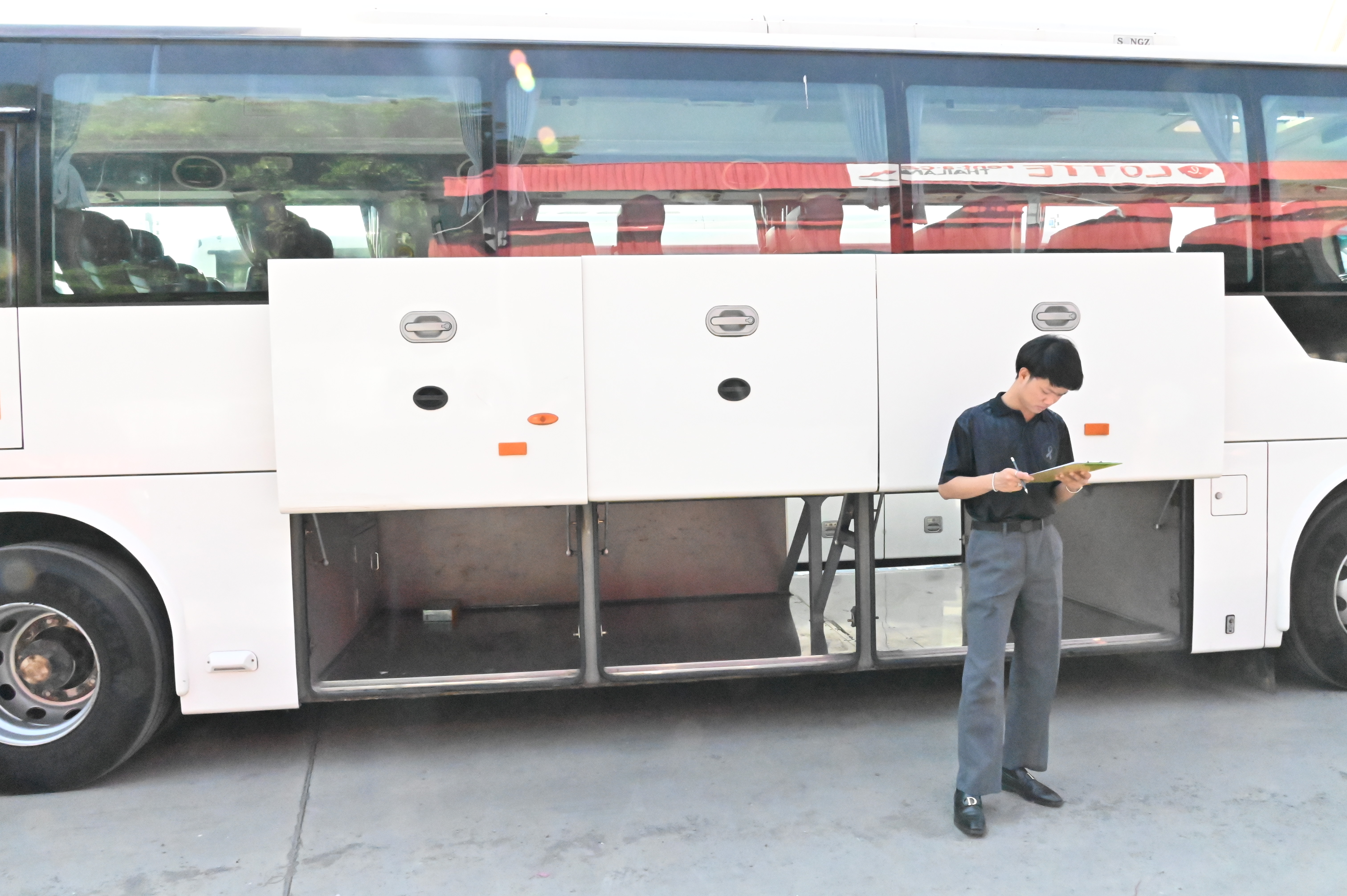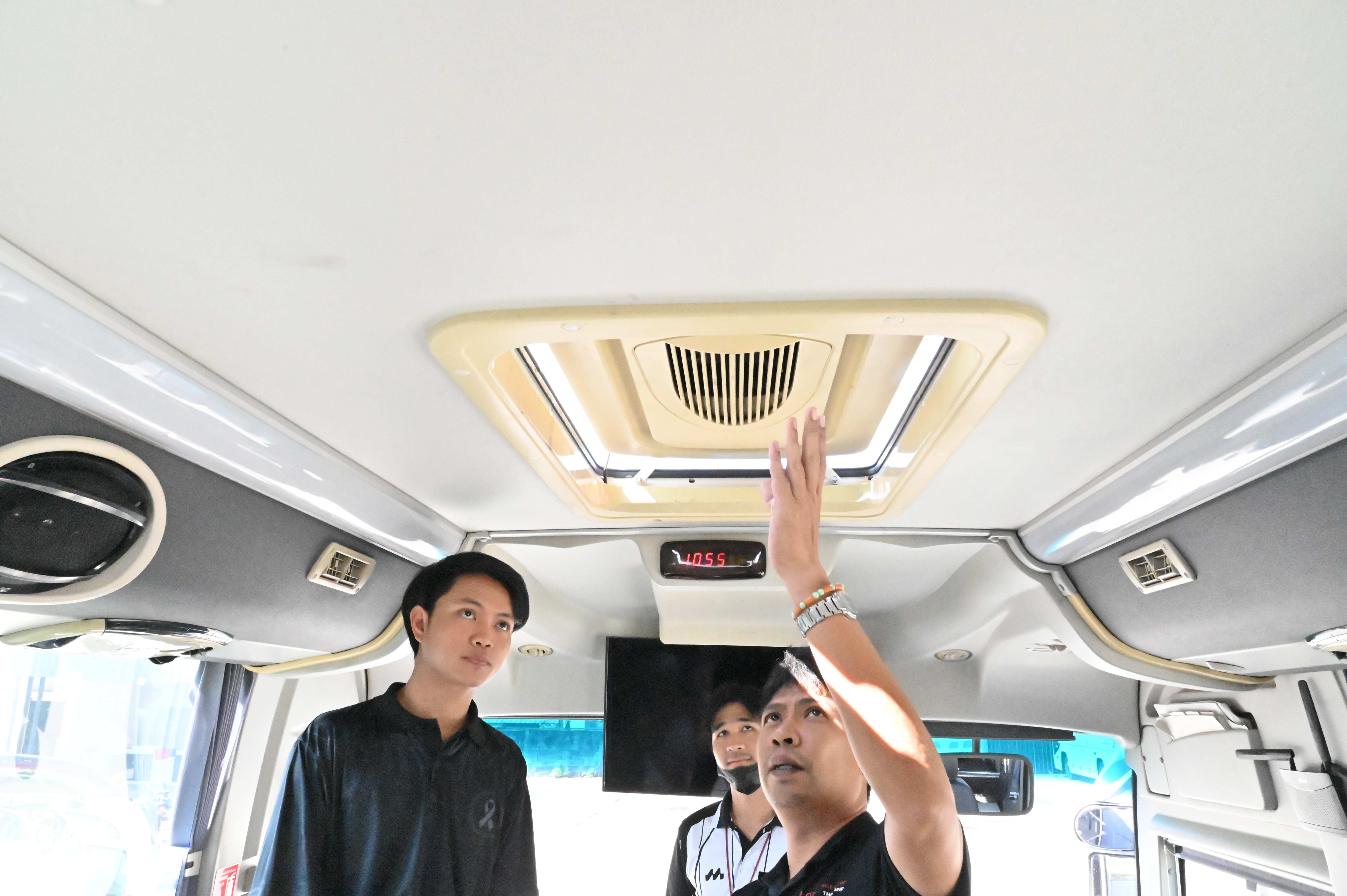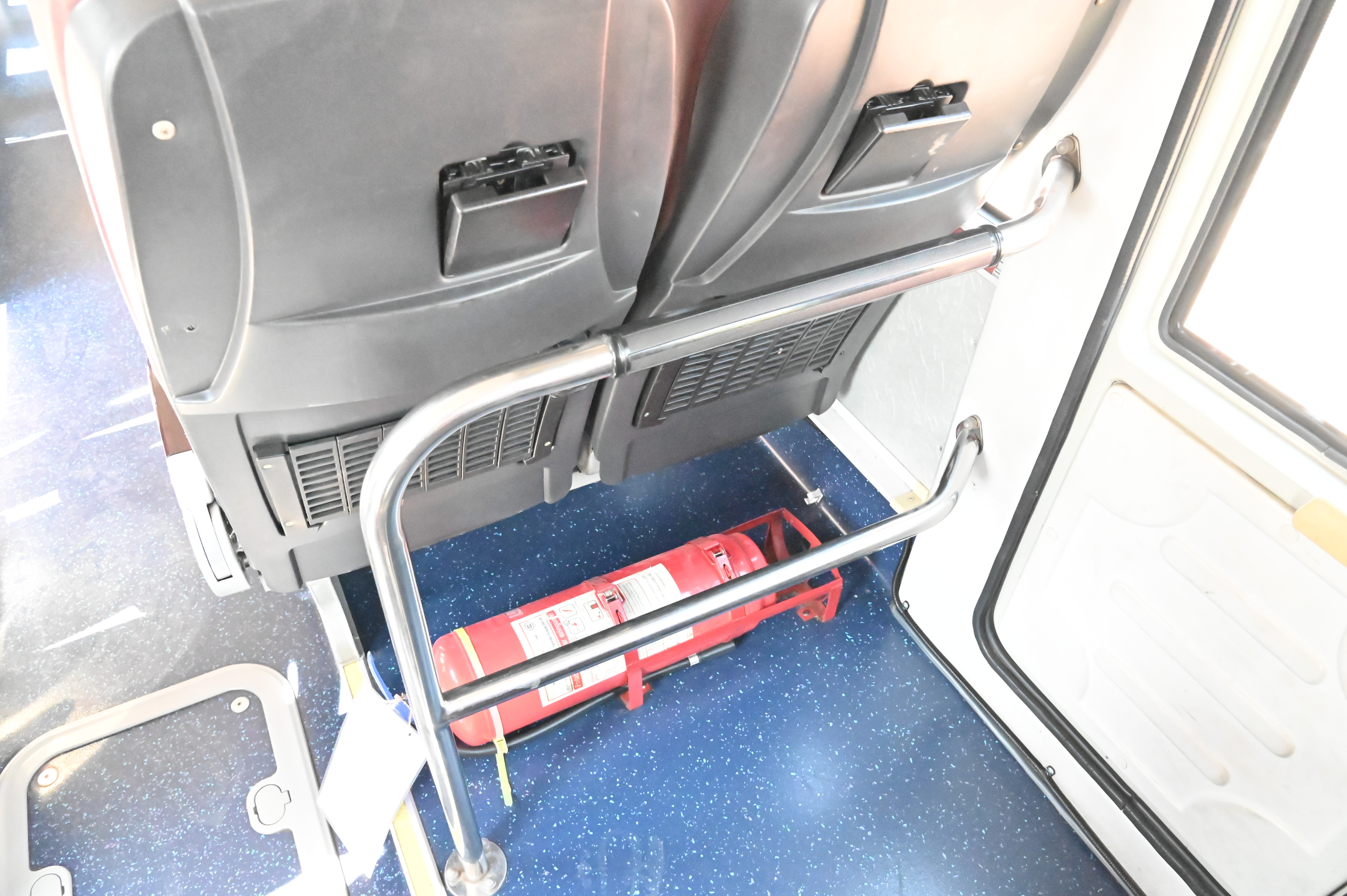 4. อุปกรณ์ความปลอดภัยภายในรถ ตรวจสอบเข็มขัดนิรภัย ที่นั่ง ทางออกฉุกเฉิน ค้อนทุบกระจก ถังดับเพลิง และชุดปฐมพยาบาลเบื้องต้น พบว่าอุปกรณ์อยู่ครบถ้วนและพร้อมใช้งาน